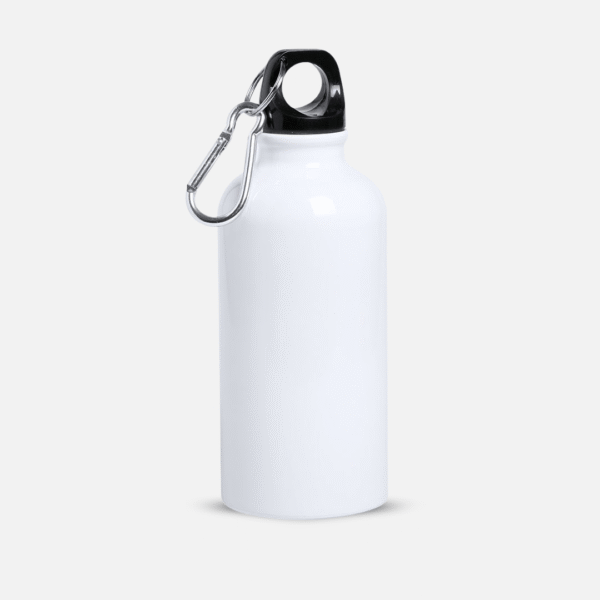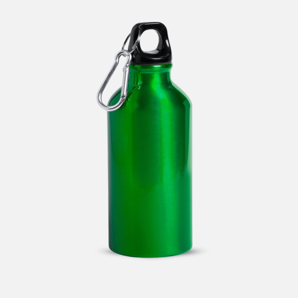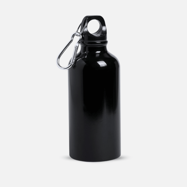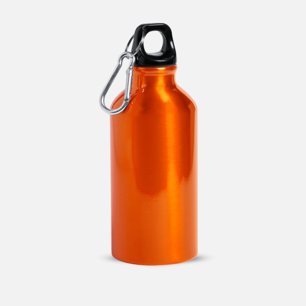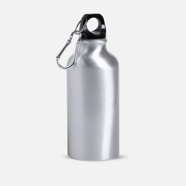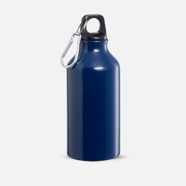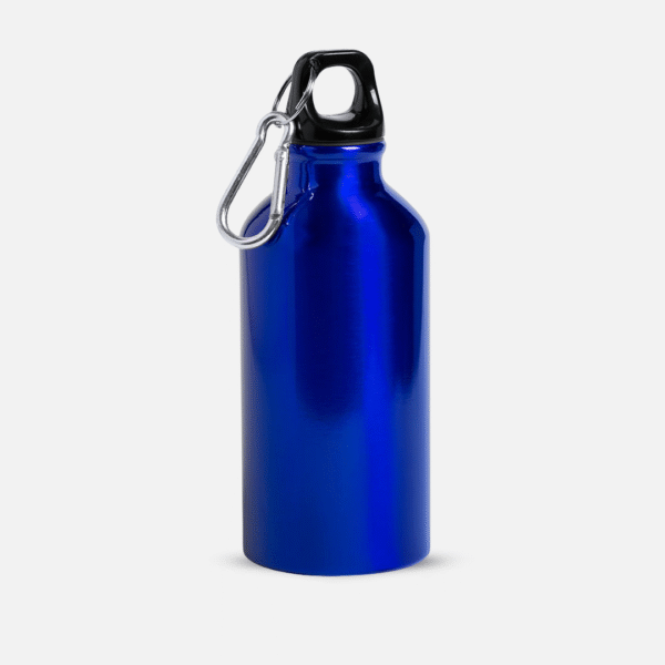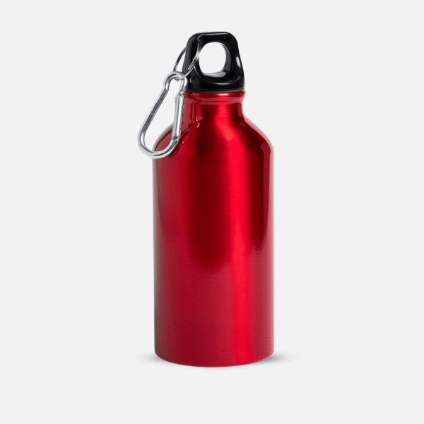 Bidón Mento 400 ml, de aluminio con acabado brillante, provisto de tapón de seguridad rosca y mosquetón metálico. Disponible en colores vivos y personalizable a todo color. Ideal para merchandising, eventos deportivos y regalos corporativos.