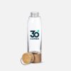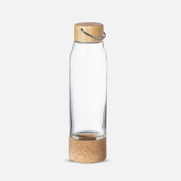 Botella de cristal Aderox personalizada con impresión digital. Fabricada en vidrio borosilicato con tapa de bambú. Ideal para marcas sostenibles, oficinas y promociones ecológicas.